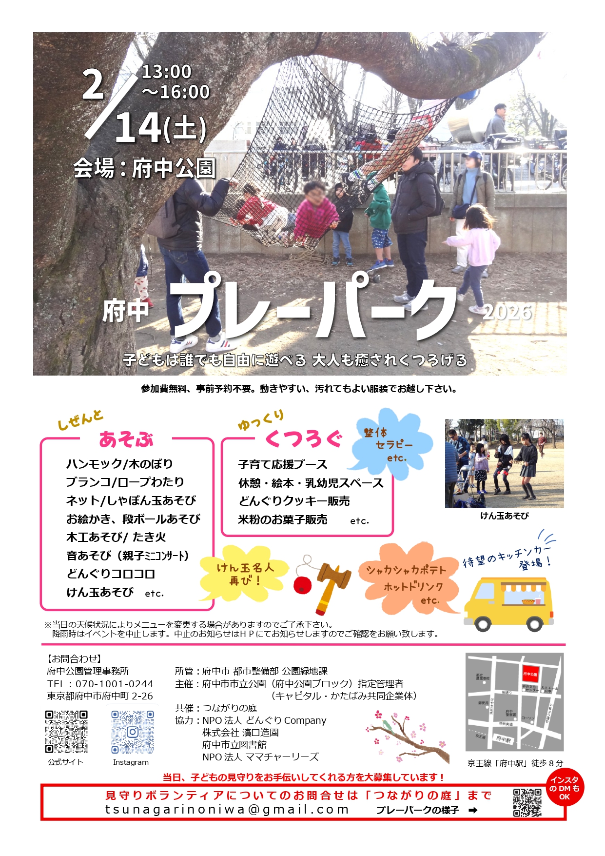 当社指定管理公園 2月イベント案内 2026年02月02日 当社が行っている指定管理公園のイベント情報(2月分)のご案内です。 皆様のご来場をお待ちしております。 公民連携事業一覧 2月 AKASAKA PARKS(東京都港区) 2月 府中公園ブロック(東京都府中市) 2月 いろは親水公園(埼玉県志木市)
