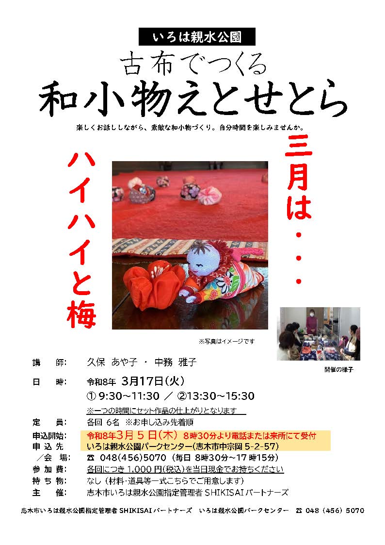 当社指定管理公園 3月イベント案内 2026年03月03日 当社が行っている指定管理公園のイベント情報(3月分)のご案内です。 皆様のご来場をお待ちしております。 公民連携事業一覧 3月 AKASAKA PARKS(東京都港区) 3月 府中公園ブロック(東京都府中市) 3月 いろは親水公園(埼玉県志木市)